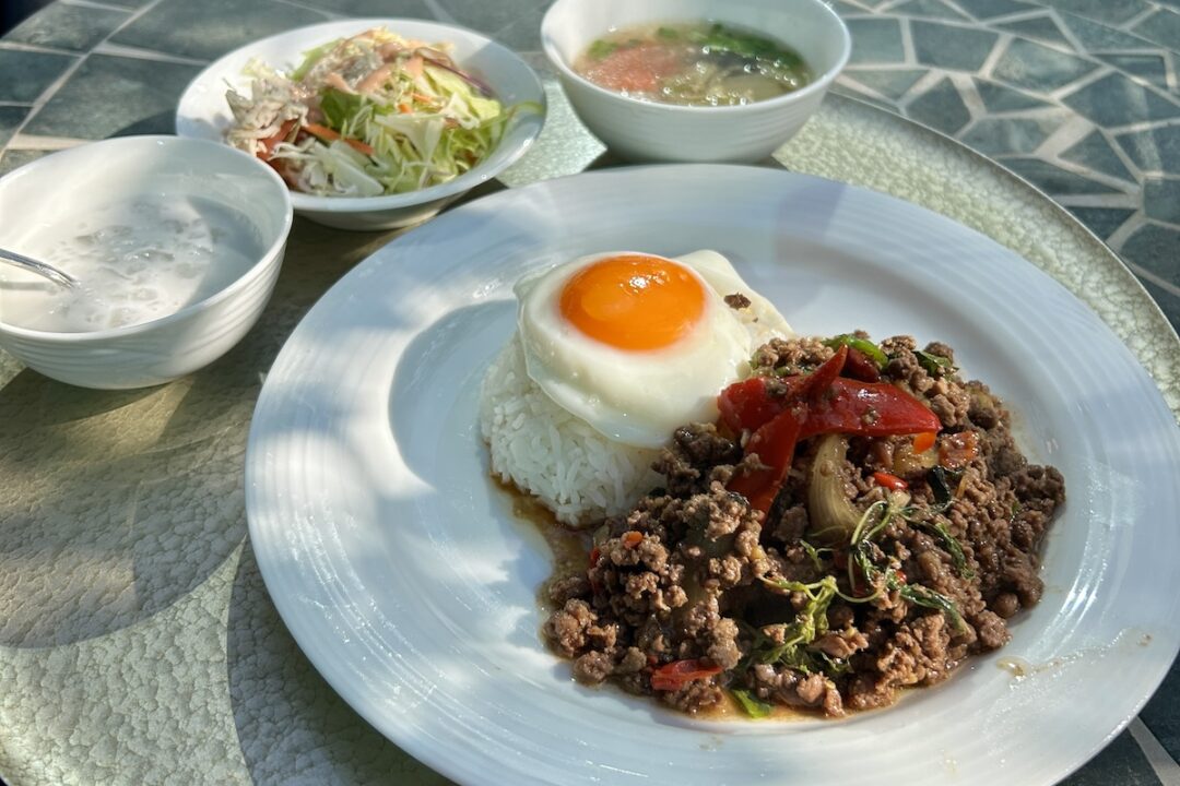 スパイシーでパンチのある味付けが特徴で、香ばしく炒められた鶏ひき肉と、バジルの香りが食欲をそそります!
